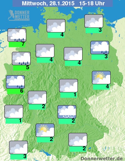 Heute Nachmittag bleiben die Wolken verbreitet dicht, dabei kann es im Süden und im äußeren Osten regional etwas auflockern, hier bleibt es auch noch am ehesten trocken. Im Norden und Westen fällt zeitweise Regen. Im Südwesten und gegen späten Nachmittag dann auch im Süden fällt zeitweise Regen, Schneeregen oder Schnee. Gegen Abend fällt auch nach Osten hin gebietsweise etwas Regen, Schneeregen oder Schnee. Dazu kann es glatt auf den Straßen werden. Die Temperatur liegt bei 1 Grad am Thüringer Schiefergebirge und bis 7 Grad an der niederländischen Grenze. Es weht ein verbreitet frischer bis starker, im Nordwesten ein stürmischer Wind, dabei sind vor allem auf den Bergen und an der Nordsee Sturmböen möglich.