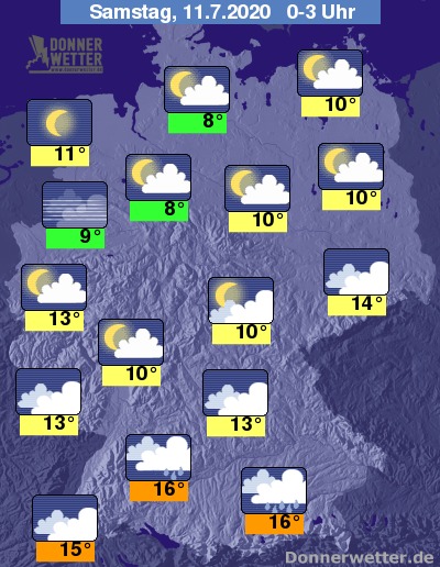 Bis zu den Frühstunden kühlt die Luft im Norden und in der Mitte häufig auf einstellige Werte ab. Im Süden sowie in Teilen von Sachsen bleibt es mit 15 bis 12 Grad noch recht mild.