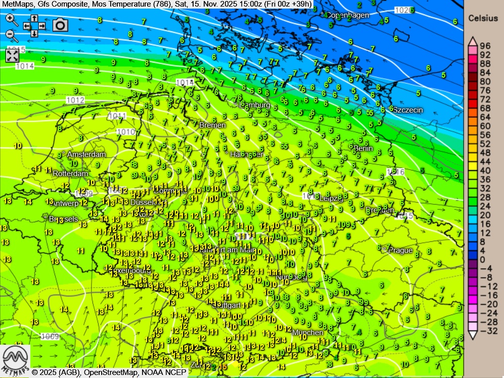 Die Strömungs- / Temperaturkarte sowie die Temperaturabweichung für Samstagnachmittag (15:00 Uhr) nach GFS: