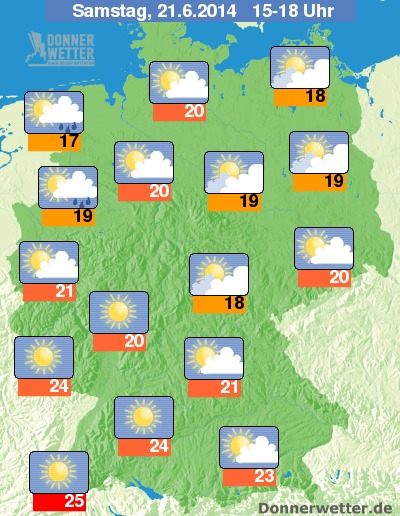 Am Abend klart der Himmel vom Süden bis in die Mitte des Landes verbreitet auf, im Norden können noch weitere, teils dichte Wolken, mit vereinzelten Schauern durchziehen, sonst bleibt es aber trocken. Die Temperatur liegt bei noch gut 20 Grad im Breisgau und etwa 15 Grad an der Müritz.