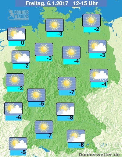 Nach einer bitterkalten Nacht erwarten uns auch am Tag teils eisige Temperaturen. Im Süden halten sich vielerorts noch dichte Nebelfelder, unter denen es mit maximal -8 Grad sehr frostig bleibt. Sonst kommt fast überall die Sonne raus. An der Nordsee sind sogar Plusgrade möglich. Schnee fällt höchstens noch im Erzgebirge.