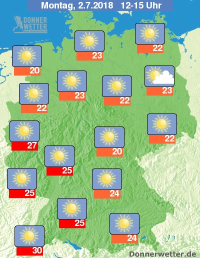 Heute Nachmittag strahlt die Sonne über dem Land von einem verbreitet wolkenlosen Himmel. Einzig über Berlin-Brandenburg sind ein paar Wolken zu erwarten, dabei bleibt es trocken. Die Temperatur liegt bei 20 Grad an der Nordsee und um 30 Grad im Breisgau.