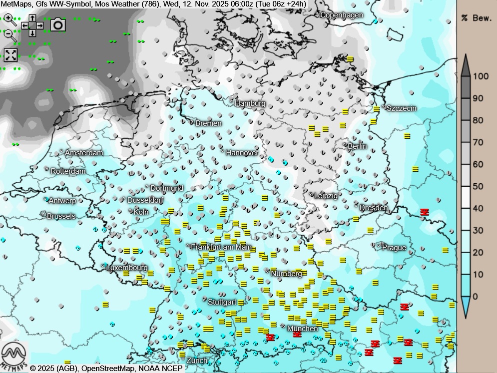 Am Mittwoch ziehen über den Norden und Nordwesten dichte Wolken hinweg, es bleibt aber meist trocken. In den übrigen Landesteilen ist es nach Nebel- / Hochnebelauflösung heiter oder sonnig.