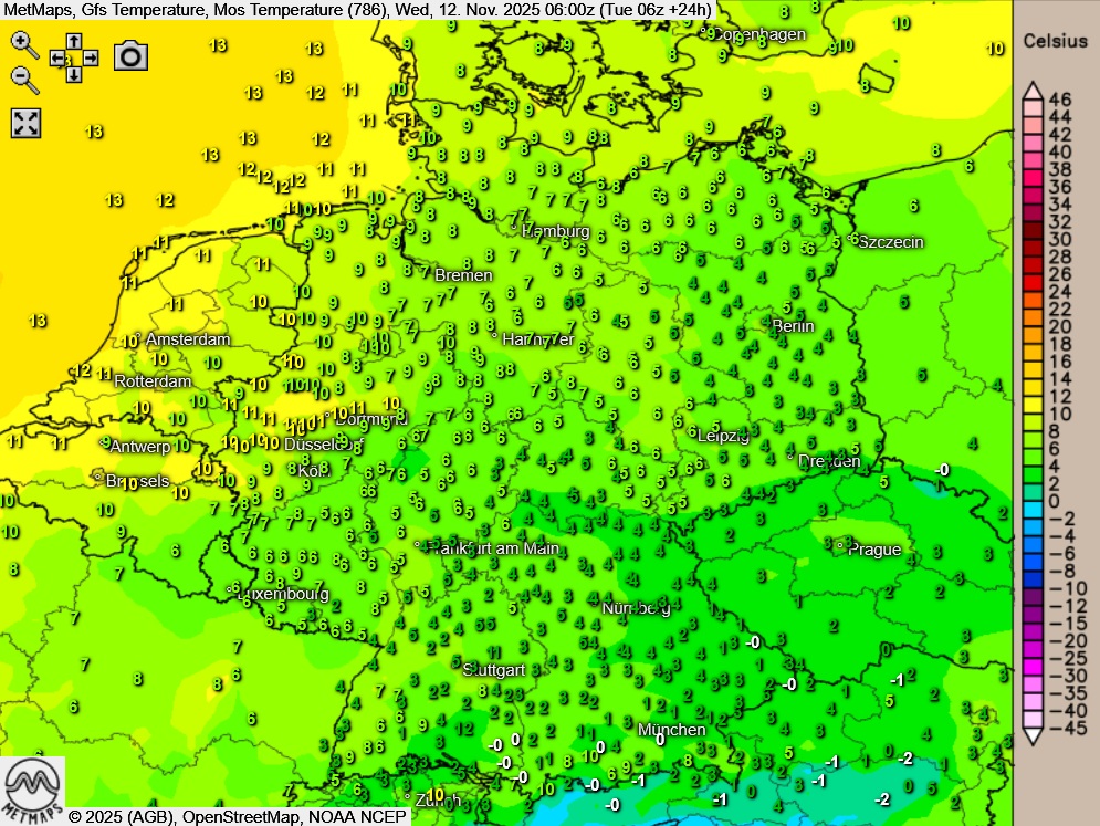 Die Lufttemperaturen sowie die Wetterkarte für Mittwochfrüh (06:00 Uhr) nach GFS: