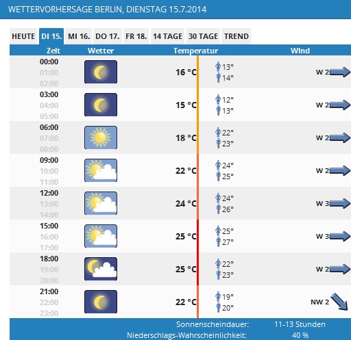 Die Temperaturen in der Bundeshauptstadt sind mit Werten um 22 - 25 Grad C am Dienstag zwar noch nicht hochsommerlich, dafür stellt sich aber der Regen weitgehend ein.