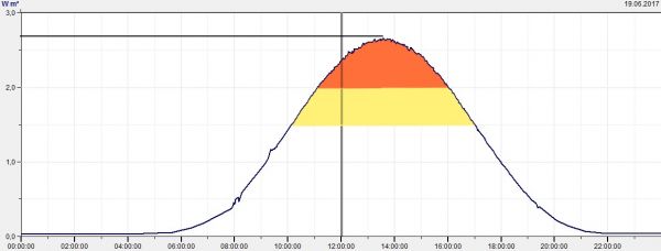 Unsere Grafik zeigt die Entwicklung der UV-B-Strahlung am gestrigen Montag. Ihr Höhepunkt wurde zwischen 11 und 15 Uhr erreicht.