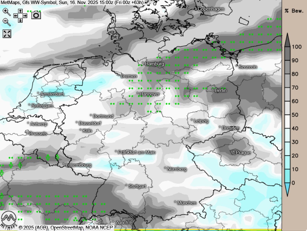 Die Wetter- und Temperaturkarte für Sonntagnachmittag (15:00 Uhr) nach GFS: