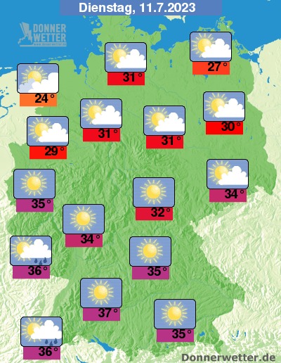 Heute ist es zunächst verbreitet heiter bis sonnig und dabei trocken. Zum späten Nachmittag und gegen Abend ziehen von Südwesten her dichte Wolken mit zum Teil kräftigen Schauern und Gewittern auf! Im Norden und Osten bleibt es aber noch meist trocken. Die Temperatur erreicht 24 Grad an der Nordsee und bis 37 Grad in Schwaben.