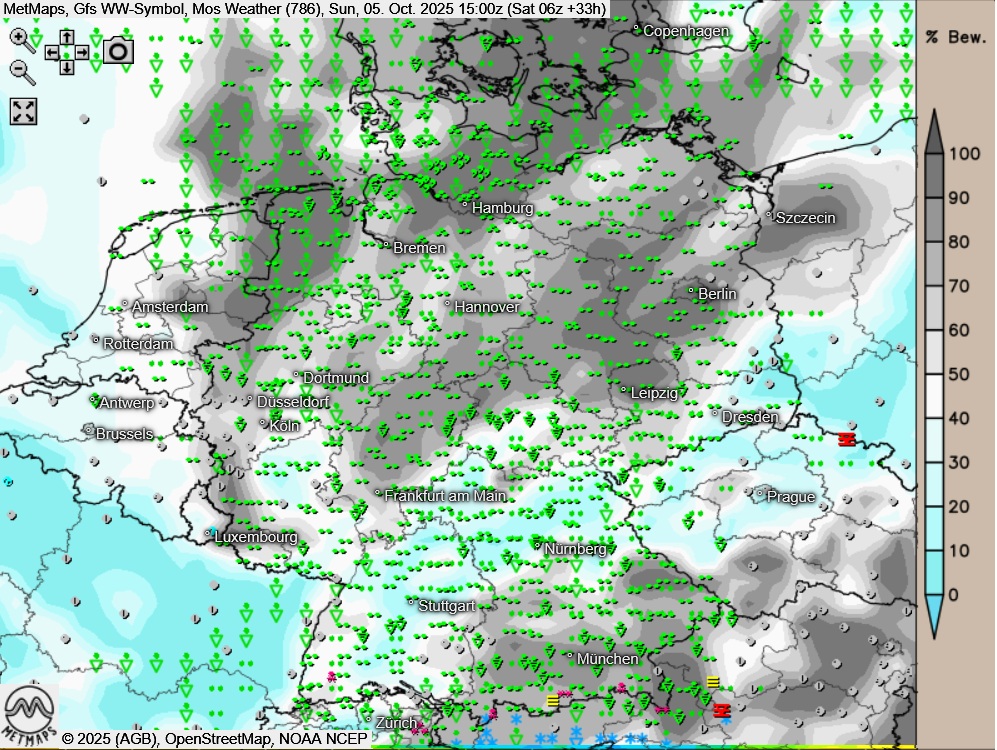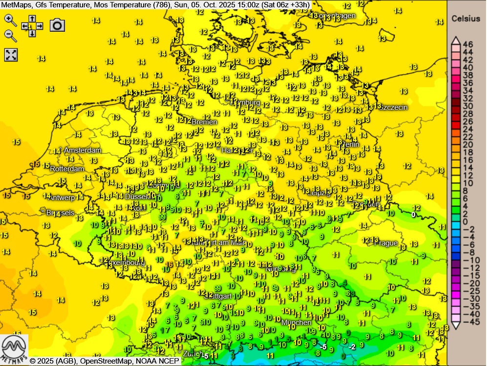Die Temperatur- und Wetterkarte für Sonntagnachmittag (15:00 Uhr) nach GFS: