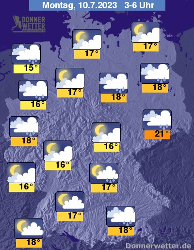 In der bevorstehenden Nacht erreichen die Schauer und möglichen Gewitter auch die östlichen Landesteile, sonst ist es oft stark, von Westen auch zunehmend längere Zeit aufgelockert bewölkt. Es bilden sich hier und da noch einzelne Schauer, oft bleibt es aber auch trocken. Die Temperatur sinkt auf tropische 21 Grad in Dresden und bis 15 Grad in Cuxhaven.