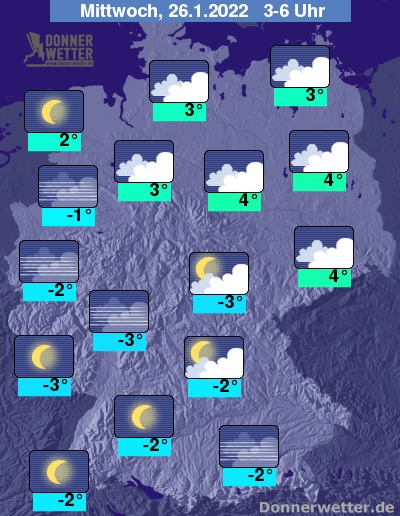 In der kommenden Nacht ist es über der Südwesthälfte weiterhin oft sternenklar, teils bildet sich Nebel. Weiter nach Nordosten hin ist es weitestgehend wolkenverhangen, jedoch bleibt es auch hier trocken. Die Temperatur sinkt auf 4 Grad in Berlin und etwa -3 Grad in Saarbrücken.
