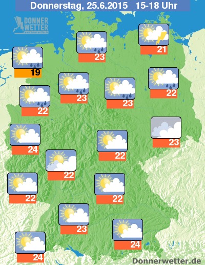 Heute Nachmittag bleibt es in der Südhälfte des Landes verbreitet heiter oder aufgelockert bewölkt und dabei trocken. Im Norden ziehen dagegen oft auch dichte Wolken durch und es können sich zeitweise Schauer, regional auch teils kräftige Gewitter bilden. Die Temperatur liegt bei 19 Grad an der Nordseeküste und bis 24 Grad am Bodensee.