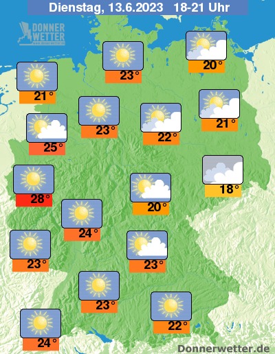 Heute Abend ist es weiterhin überwiegend heiter oder sonnig und trocken. Im Osten, aber auch im Nordosten ziehen jedoch viele und teilweise dichte Wolken auf, dazu bleibt es aber weitgehend trocken. Die Temperatur liegt bei 18 Grad in Chemnitz und bis 28 Grad in Köln.