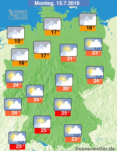 Heute bleibt es über der Nordhälfte überwiegend stark bewölkt, aber bis auf wenige Ausnahmen in den östlichsten Landesteilen auch trocken. Weiter nach Süden hin ist es hingegen meist heiter bis sonnig, südlich des Mains sind allerdings gebietsweise Schauer und Gewitter möglich, sonst bleibt es aber weitgehend trocken. Die Temperatur steigt auf 15 Grad an der Nordsee und bis 25 Grad im Breisgau.