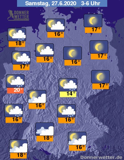 Während der zweiten Nachthälfte treten insbesondere in einer Zone vom Münsterland, quer über die Mitte unseres Landes, bis zur Oberpfalz noch lokale Regengüsse auf. In den übrigen Landesteilen leuchten Mondsichel und Sterne, im Nordosten von einem meist blankgeputzten, im Südwesten im Wechsel mit einigen Wolken vom Himmel.