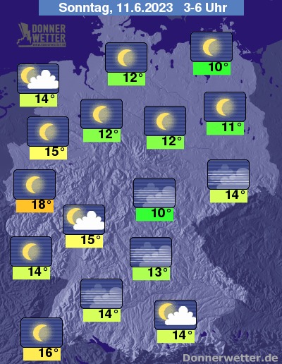 In der Nacht zum Sonntag klingen letzte Niederschläge im Süden rasch ab und der Himmel klart auch hier, wie sonst schon zuvor verbreitet im übrigen Bundesgebiet, auf. Die Temperatur sinkt auf 18 Grad in Köln und bis 10 Grad in Erfurt.