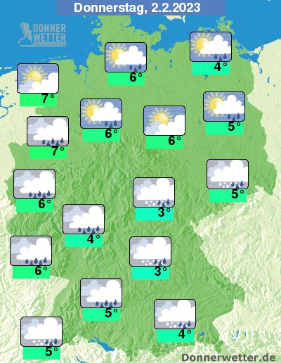 Heute zeigen sich im Norden und Osten oft heitere Abschnitte, teils ziehen hier jedoch auch dichte Wolken durch, die vereinzelt Schauer mitbringen. Im übrigen Bundesgebiet ist es meist stark bewölkt und es fällt gebietsweise Regen, Schneeregen oder Schnee. Die Temperatur steigt auf 3 Grad in Erfurt und bis 7 Grad in Meppen. An der See weht ein oft stürmischer Wind.