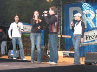 Mit etwas mulmigem Gefühl hatte ich am Morgen bei 'André und den Morgenmädels' noch verkündet, dass die Regenwolken zum Abend abziehen, 'eigentlich, wahrscheinlich, denke ich, müsste es trocken bleiben'. Aber wenn man dann abends vor den Leuten auf der Bühne steht, hat man doch etwas Angst, dass ein letzter Regenschauer das Startsignal zum 'Wir-verhauen-den-Wettermann' gibt...