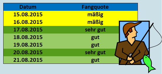 Am Neumondtag (Freitag) herrschen mit Schauern und Gewitter noch gute Angelbedingungen, die am Wochenende jedoch mit zunehmendem Mond sowie auffrischendem Wind wieder relativiert werden.