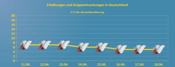 Bis zum Ende der Woche sinkt die Anzahl der Bevölkerung, die nun unter einer Erkältungs- oder Grippeerkrankung leiden, unter die 5-Prozent-Marke. Nur jeder 20. Bürger leidet in Deutschland also aktuell unter Symptomen.