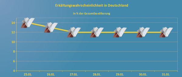 Das etwas mildere Wetter sorgt zu Wochenbeginn für geringere Erkältungszahlen. Weiterhin besteht aber ein Risiko, sich mit der bereits im Balkanraum und der Türkei grassierenden Schweinegrippe anzustecken. Ein Übergreifen der Welle nach Deutschland ist nicht unwahrscheinlich.