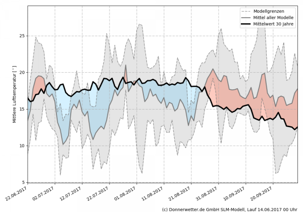 Auch in der Südhälfte sieht es nach wie vor nach einem insgesamt zu kühlen Sommer 2017 aus, zudem liegen die zu erwartenden Niederschlagsmengen meist über dem 30-Jahres-Mittel. Die Sonnenscheindauer zeigt sich über die Sommermonate weiterhin launisch, die sonnigsten Phasen erwarten uns zwischen Ende Juni und Anfang Juli sowie ab Ende August.