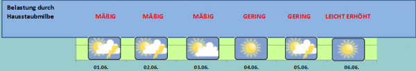 Durch das sehr warme und trockene Wetter herrscht so gut wie keine Belastung der Milben bis Ende der Woche in Deutschland. In der neuen Woche hingegen nimmt die Belastung ein wenig zu, da die Temperaturen ein wenig fallen und die Niederschlagswahrscheinlichkeit höher liegt.