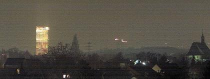 Vor dem Feuerwerk sind von der Donnerwetter.de-Zentrale in Bonn deutlich der Post-Tower in 4,4 Kilometer Entfernung sowie Häuser und Kirche im Vordergrund sind deutlich zu sehen. Die Sichtweite betrug nach Messungen 7,7 Kilometer.