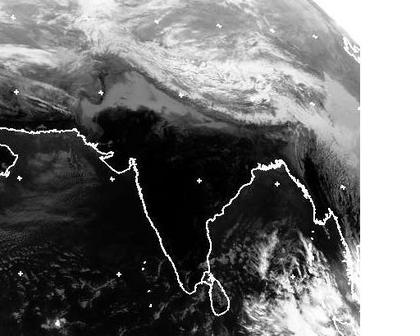 Auf dem Satellitenbild von Mittwoch früh sind Indien und die nördlicheren Regionen nahezu wolkenfrei. Gut zu erkennen ist auch der Verlauf des Himalayagebirges, dass sich mit seinen kühleren Temperaturen (im Infrarotbereich heller dargestellt) deutlich vom wärmeren Indien abhebt. (Bildquelle: NERC Satellite Receiving Station, Dundee University, Scotland, http://www.sat.dundee.ac.uk/)
