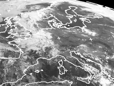 Auf dem Satellitenbild vom Morgen erkennt man starke Bewölkung, die von Nordfrankreich bis ins westliche Nordrhein-Westfalen reicht. Zum Teil ist es die Bewölkung von Schauern und Gewittern, teils hat sich aber auch in der sehr feuchten Luft Hochnebel gebildet. Weiter nach Osten findet man verbreitet kaum Wolken. Nur über Polen liegt die Bewölkung einzelner Gewitter. Aber auch in Deutschland dehnen sich die Gewitter heute im Tagesverlauf aus. (Bildquelle: NERC Satellite Receiving Station, Dundee University, Scotland, http://www.sat.dundee.ac.uk/)