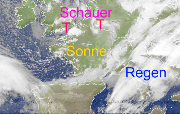 Von Frankreich ziehen immer wieder kleinere Wolkenwirbel nach Deutschland und sorgen gebietsweise für Niederschläge. In mittleren und höheren Lagen fällt dabei meistens Schnee, in tieferen Lagen eher Regen oder je nach Intensität auch mal Schneeregen. Dazwischen findet man aber auch größere trockene Gebiete, in denen die Wolkendecke zum Teil auch mal auflockert und einigen Sonnenstrahlen Platz bietet. Morgen wird es mit Winddrehung auf West bis Nordwest ein wenig kälter, so dass bei auftretenden Schauern auch in tieferen Lagen mit Schnee oder Schneeregen gerechnet werden muss. Bei nächtlichem Aufklaren gehen die Temperaturen in den leichten Frostbereich zurück, so dass dann die Gefahr von überfrierender Nässe besteht.