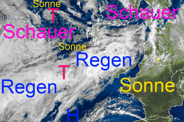 Die kompakten Regenwolken des Tiefs über dem Atlantik steuern Richtung Mitteleuropa und sorgen morgen vor allem über den mittleren Teilen von Deutschland für ungemütliches und kühles Wetter. Nördlich davon erkennt man verschiedene Wolkenstrukturen mit räumlichen Regenfällen oder Schauern, aber auch einigen freundlichen Bereichen.