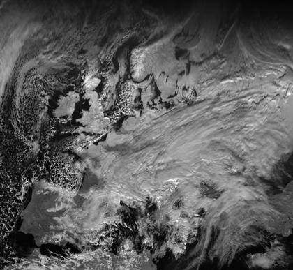 Der Wolkenschirm des mächtigen Tiefs 'Daisy' mit Zentrum über Norditalien hat sich schon über weite Teile Mitteleuropas ausgedehnt. Über den Britischen Inseln und Südskandinavien sorgt Hochdruckeinfluss für eher wenige Wolken. Durch die Schneedecke sind die Landflächen aber weiß.