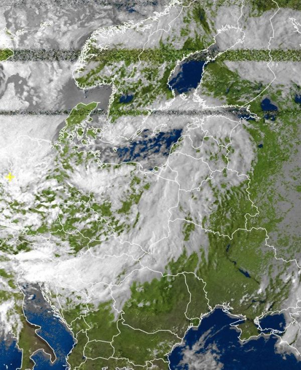 Das Satellitenfoto von heute Nachmittag zeigt über weiten Teilen von Europa viele Wolken. Besonders dicht hielten sich dabei die Wolken entlang eines breiten Streifens von der nördlichen Adria, über den Balkan, über Osteuropa bis an die finnische Ostseeküste. Unter den dichten Wolken regnete und regnet es auch weiterhin zum Teil langanhaltend und kräftig.