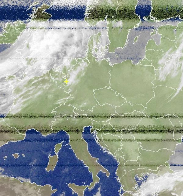 Über den Nordwesten Deutschlands ziehen dicke Wolkenschichten her die den Himmel bedecken. Der Osten Europas dagegen ist mit einem klaren Himmel verschohnt von regnerischen Wolken.
