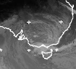 Ein Tief liegt auf dem Satellitenbild von Samstag früh über Tasmanien und Südostaustralien. Vor allem die Schauer, die sich in der kühleren Luftmasse hinter der Kaltfront gebildet haben, sind über Australien gut zu erkennen. Im Laufe des Tages sorgen diese Schauer für teils kräftige Regen, an den Küsten auch teils für kräftigen Wind.