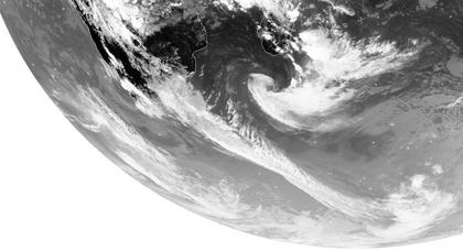 Ähnlich wie auf der Nordhalbkugel ziehen auch in der südlichen Hemisphäre in schöner Regelmäßigkeit Tiefdruckgebiete von West nach Ost (aufgrund der Corioliskraft) entlang einer Polarfront. Am Montag Mittag zeigt das Satellitenfoto an der südlichen Spitze von Afrika 3 solcher Tiedruckgebiete. Dabei liegt ein Wolkenband südöstlich, ein weiteres südwestlich bis fast zur Antarktis und ein kleineres Tiefdruckgebiet südlich von Madagaskar. (Bildquelle: NERC Satellite Receiving Station, Dundee University, Scotland, http://www.sat.dundee.ac.uk/)