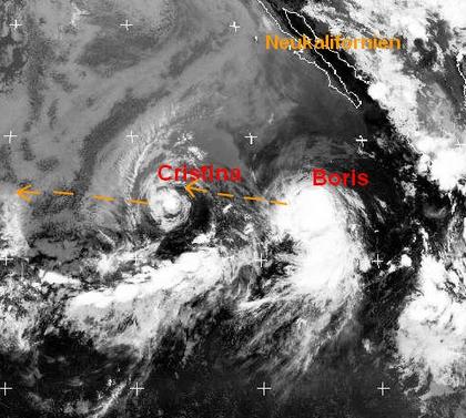 Der Ausschnitt zeigt zwei tropische Wirbelstürme über dem östlichen Pazifik. Die Windgeschwindigkeiten beider Stürme erreichen etwa 80, in Böen bis 100 km/h. Berechnungen zufolge bewegen sie sich unter Abschwächung nach Westen und überqueren dabei keine bewohnte Insel. (Bildquelle: NERC Satellite Receiving Station, Dundee University, Scotland, http://www.sat.dundee.ac.uk/)