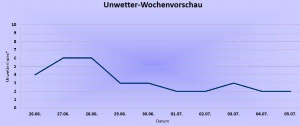 Die Unwettergefahr zeigt sich in der ersten Wochenhälfte noch häufig erhöht. Am Montag bilden sich im Süden vielerorts Schauer und örtlich kräftige Gewitter. Am Dienstag betrifft es dann besonders die Südhälfte des Landes, denn von Südwesten ziehen feuchtwarme Luftmassen herein. Am Mittwoch liegt der Gewitterschwerpunkt bevorzugt über den östlichen Landesteilen, während es in der Westhälfte deutlich ruhiger wird. Donnerstag sollten sich im Osten und Nordosten noch hier und da kräftigere Gewitter entwickeln. Ab Freitag und auch über das Wochenende hinaus bleibt das Unwetterrisiko voraussichtlich weitgehend auf niedrigem Niveau.