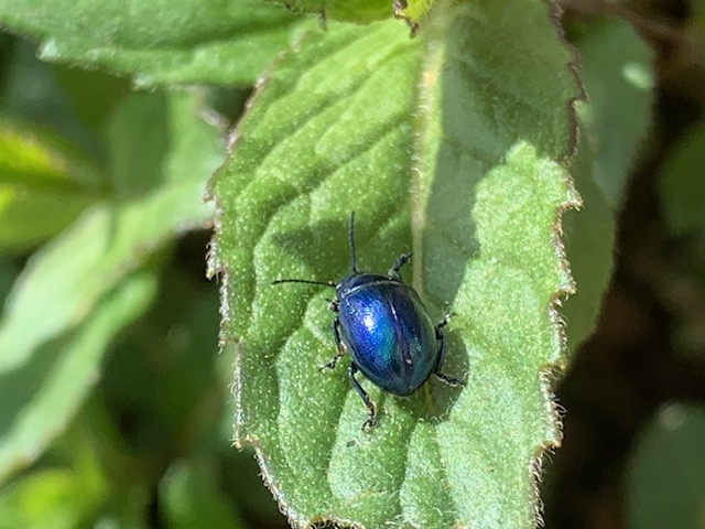 Der Minzblattkäfer ist ein kleiner, metallisch glänzender Käfer, der sich auf verschiedene Minzarten spezialisiert hat.