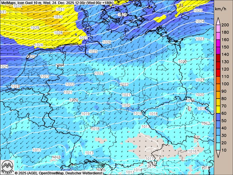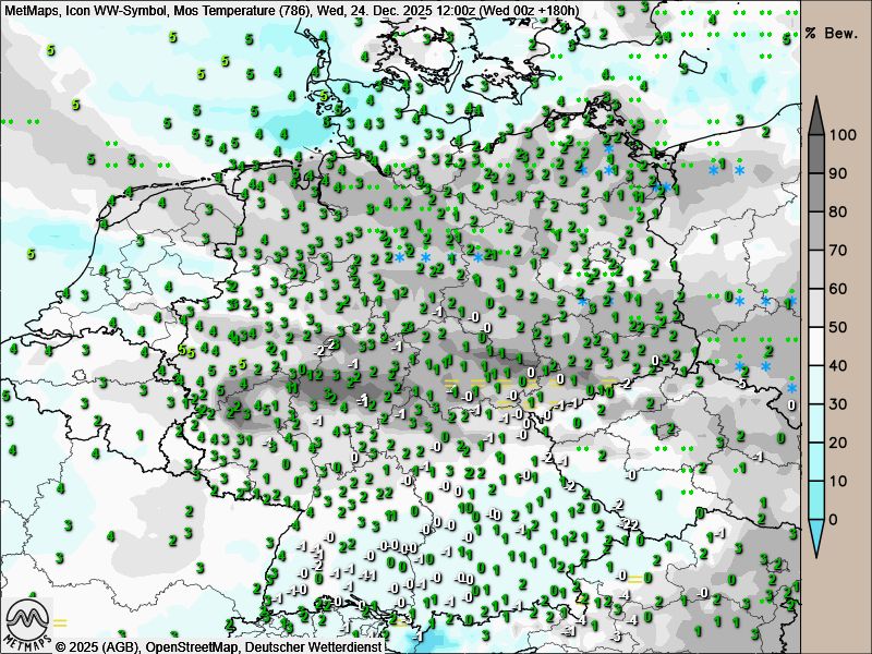 Mit dem zunehmenden Ostwind setzt sich kontinentale Kaltluft durch. Nach aktuellen ICON-Berechnungen liegen die Lufttemperaturen an Heiligabend vielerorts nur noch zwischen 1 und 5 Grad, in höheren Lagen ab etwa 500 Metern herrscht Frost. Trotz der deutlich kälteren Luft bleibt es in den Niederungen überwiegend schneefrei.