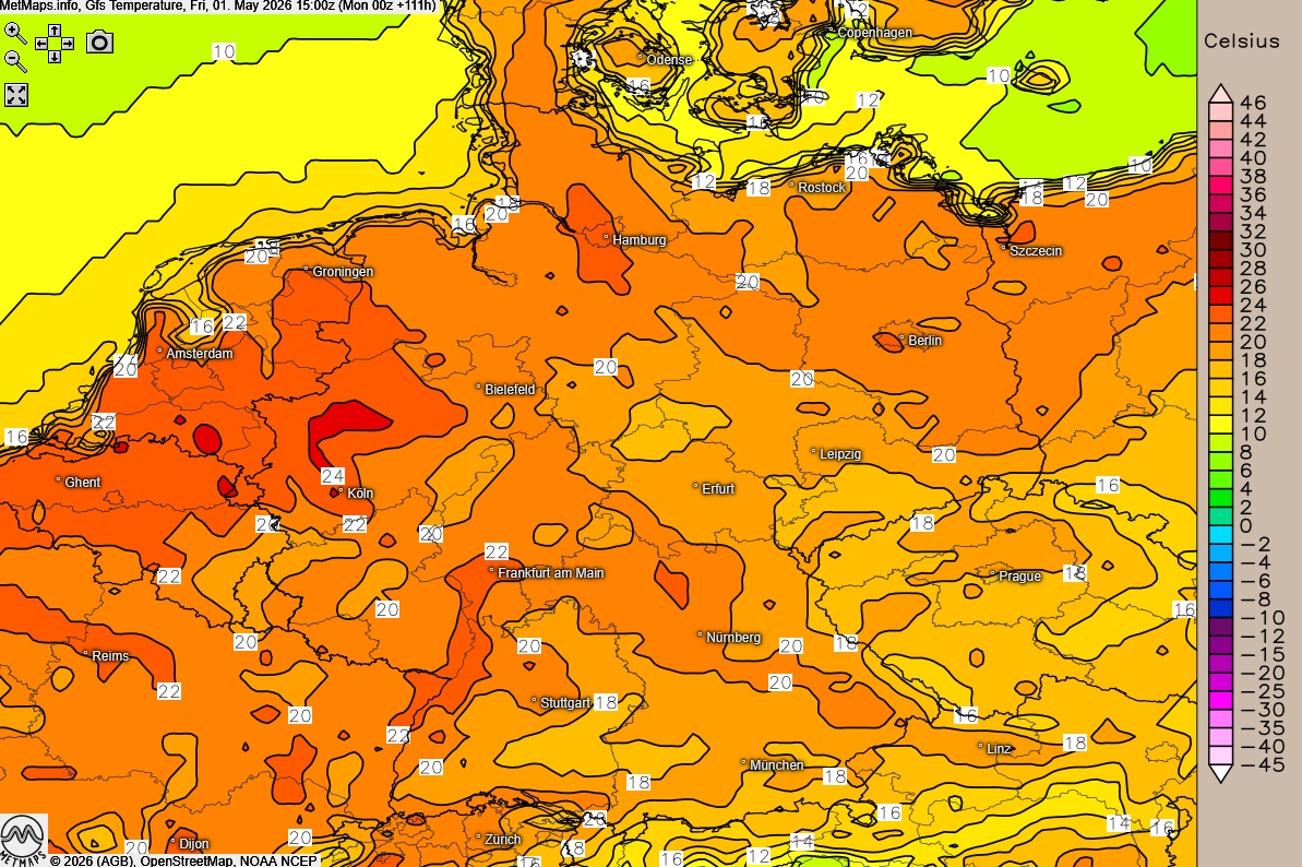 Bei einer Niederschlagswahrscheinlichkeit von 0 % klettern die Temperaturen am 1. Mai verbreitet auf Höchstwerte um die 19 bis 21 Grad, wobei es regional sogar noch deutlich wärmer werden kann: Gebietsweise sind am Feiertag sogar sommerliche Temperaturen um 25 Grad möglich.