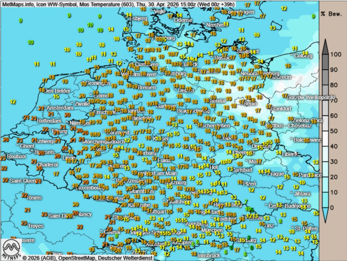 Temperaturabweichung und Temperatuen 01.05. (15:00 Uhr) nach Icon
