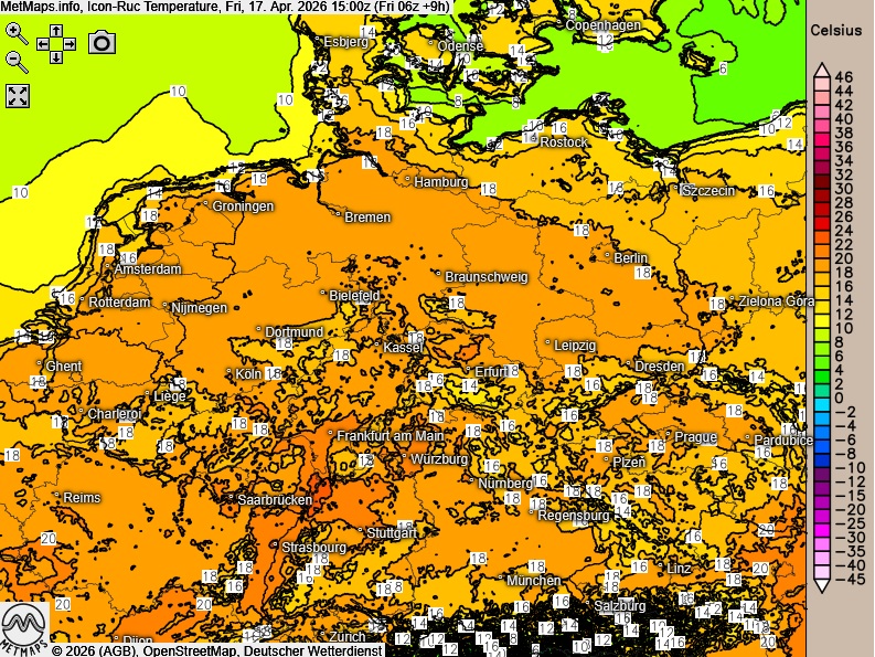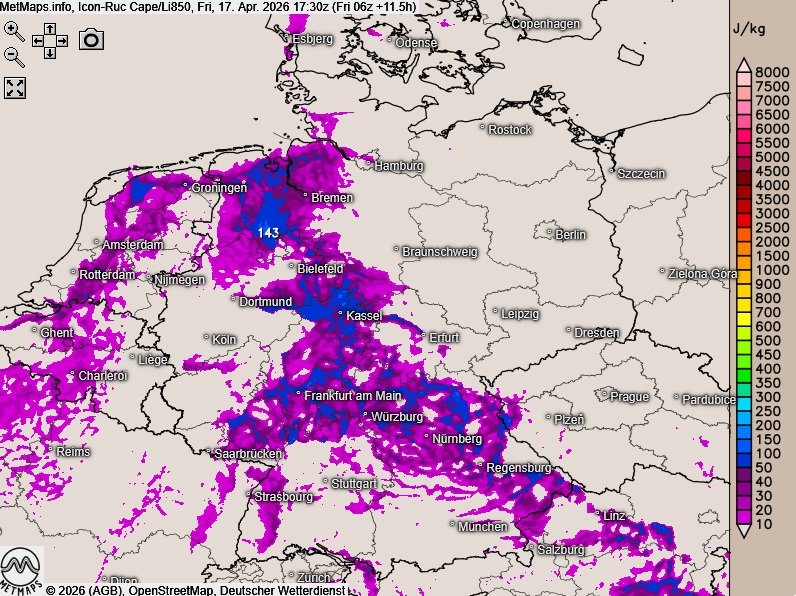 Die Wetter- und Temperaturkarte für 15:00 Uhr sowie die Cape-/Lifted-Karte (850 hPa) für 17:30 Uhr nach ICON-RUC: