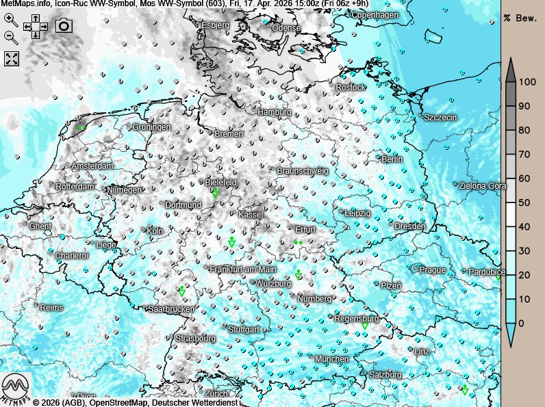 Am Freitagnachmittag zeigt sich der Himmel über weiten Landesteilen heiter bis wolkig, im Nordwesten ist es auch stärker bewölkt. In der Mitte und im Südosten sind am Nachmittag einzelne Schauer und Gewitter möglich, sonst bleibt es meist niederschlagsfrei. Es weht ein schwacher bis mäßiger Wind aus wechselnden Richtungen.