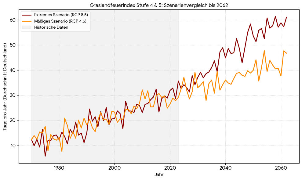 Die Zukunftsszenarien bis zum Jahr 2062 lassen wenig Spielraum für Optimismus und verdeutlichen die Dringlichkeit von Anpassungsmaßnahmen. Selbst in einem mäßigen Klimaszenario (RCP 4.5) werden die Gefahrentage weiter zunehmen und sich dauerhaft auf einem hohen Niveau stabilisieren. Sollten die globalen Emissionen jedoch ungebremst weiterlaufen, wie im extremen Szenario (RCP 8.5) berechnet, steuern wir auf eine völlig neue Gefahrendimension zu. Wir blicken dann auf durchschnittlich über 60 Tage pro Jahr mit höchster Brandgefahr – das bedeutet zwei volle Monate, in denen unsere Natur unter extremer Spannung steht!