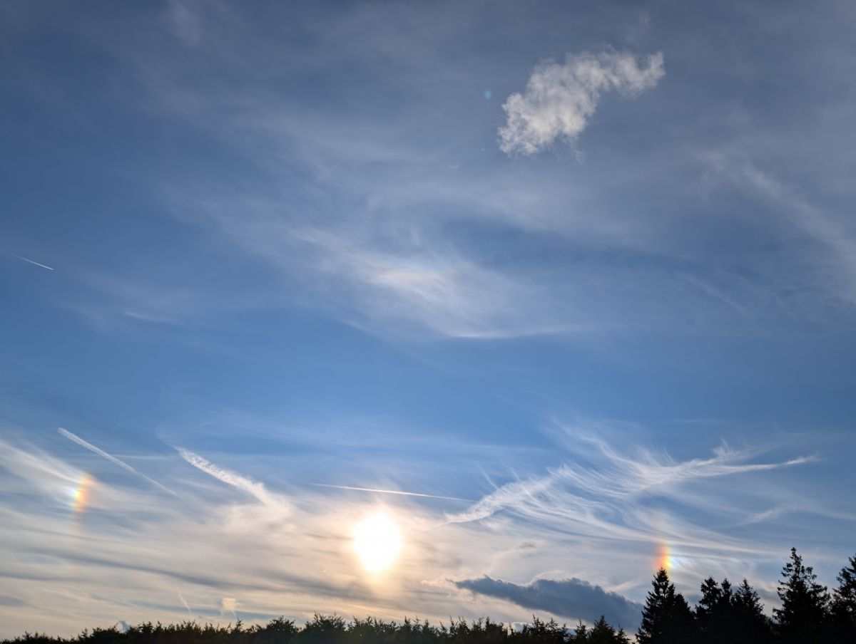 Die Fotos zeigen Nebensonnen und Zirkumzenitalbogen gestern Abend über dem donnerwetter.de-Wetterpark in der Eifel. Ein Video findet Ihr auf Facebook und TikTok.