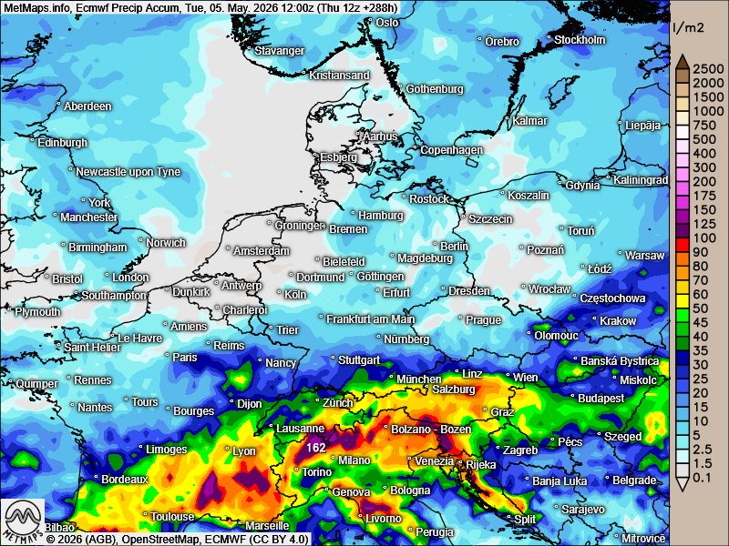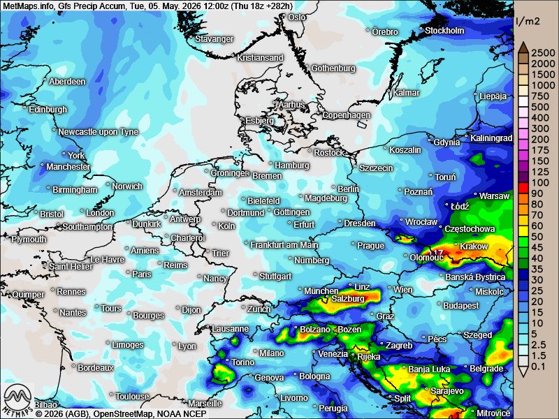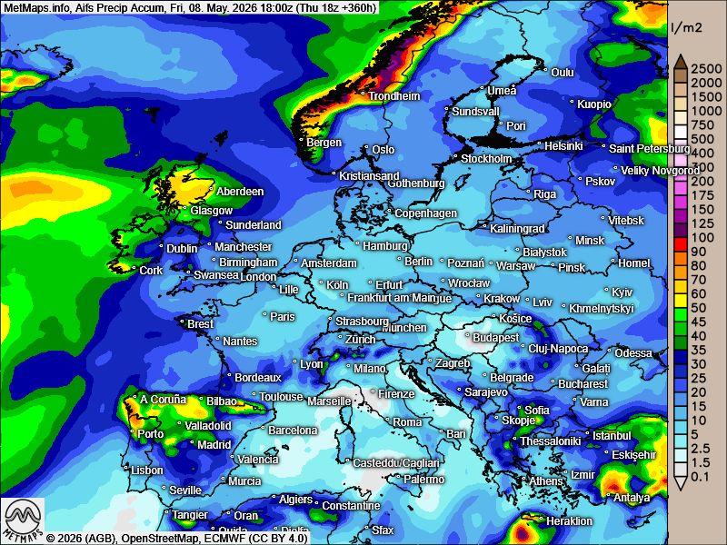Die akkumulierten Regenmengen bis 05. bzw. 08.05.2026 nach GFS, ECMWF und AIFS: