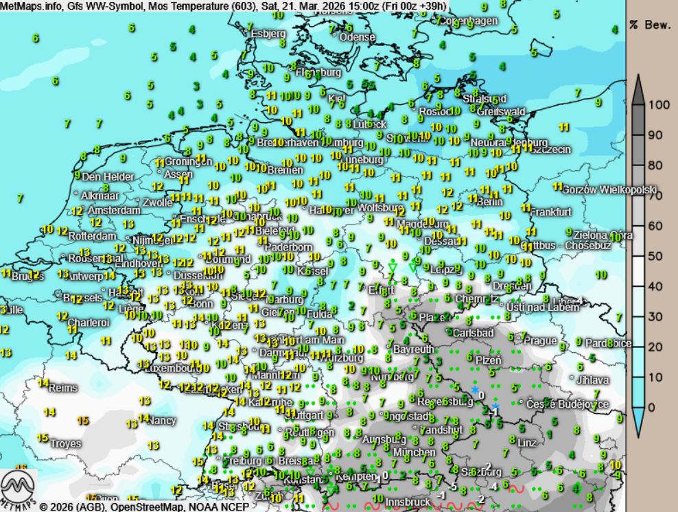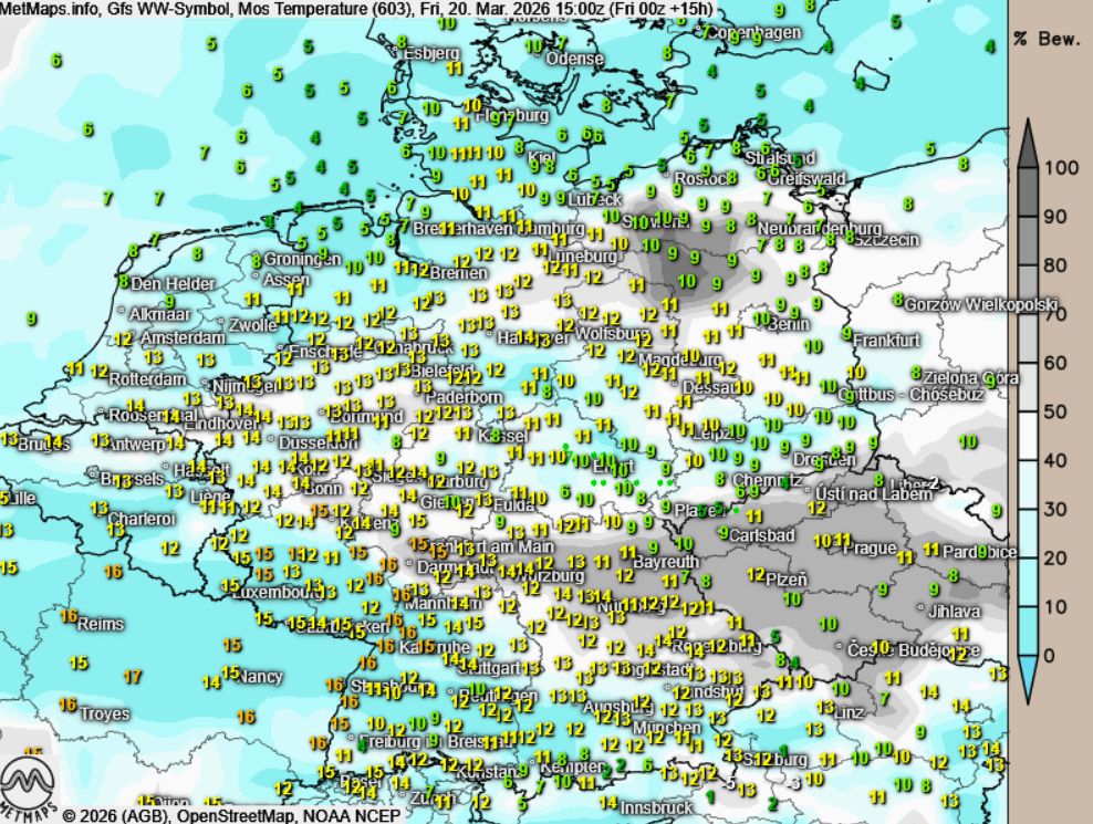 Zum Beginn des astronomischen Frühlings zeigt sich das Wetter in Deutschland uneinheitlich: Am heutigen Freitag zieht eine schwache Kaltfront über den Osten und die Mitte des Landes hinweg und bringt dort mehr Bewölkung sowie leicht rückläufige Temperaturen mit sich.