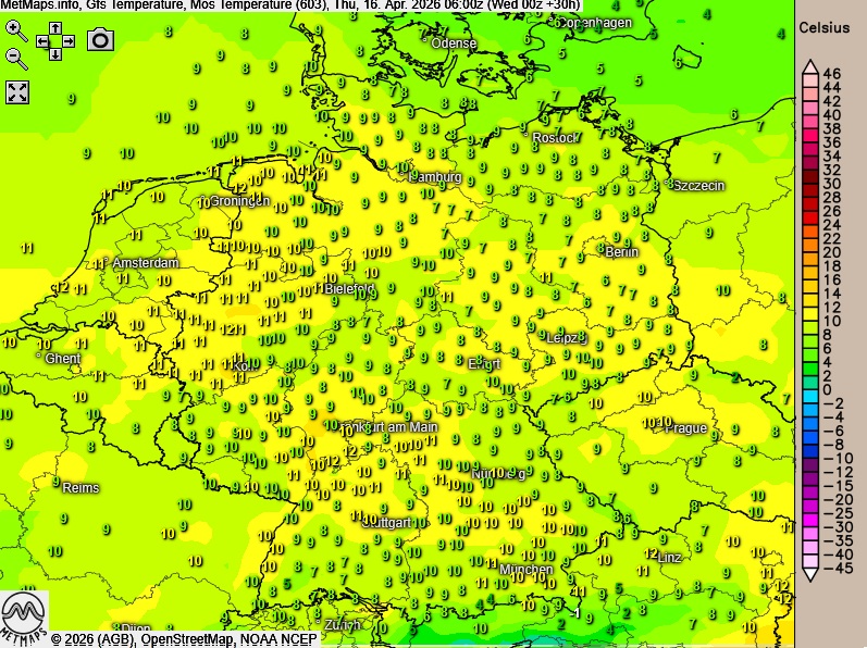 Die Wetter- und Temperaturkarte für Donnerstagfrüh (06:00 Uhr) sowie die 24-Stunden-Regenmengen für Donnerstag nach GFS: